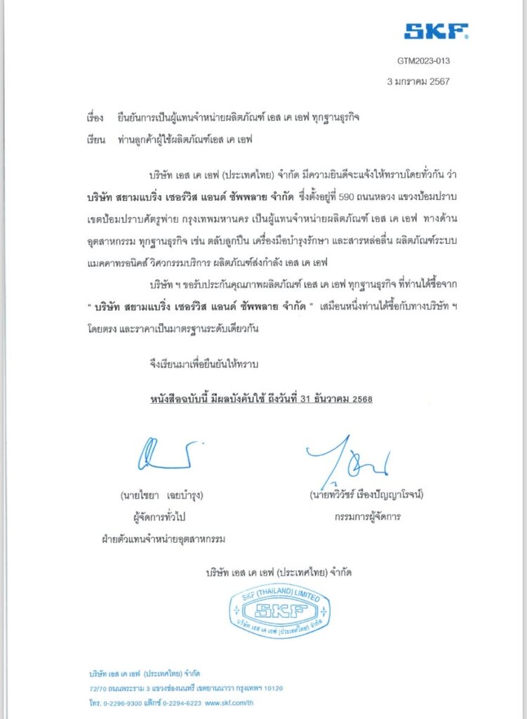 เอกสารแต่งตั้งตัวแทนจำหน่ายผลิตภัณฑ์ SKF